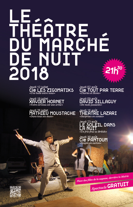Depuis plusieurs années maintenant, la municipalité de Saint-Trojan-les-Bains à mis en place un rendez-vous théâtral hebdomadaire à l’occasion de son marché de nuit estival. Tous les jeudis soirs du 12 juillet au 30 aoûtà partir de 21h30 sur la scène du théâtre de rue – entre le marché couvert et la mairie de Saint-Trojan-les-Bains.Spectacles gratuits – pour toute la famille Afficher Théâtre de rue sur une carte plus grande |